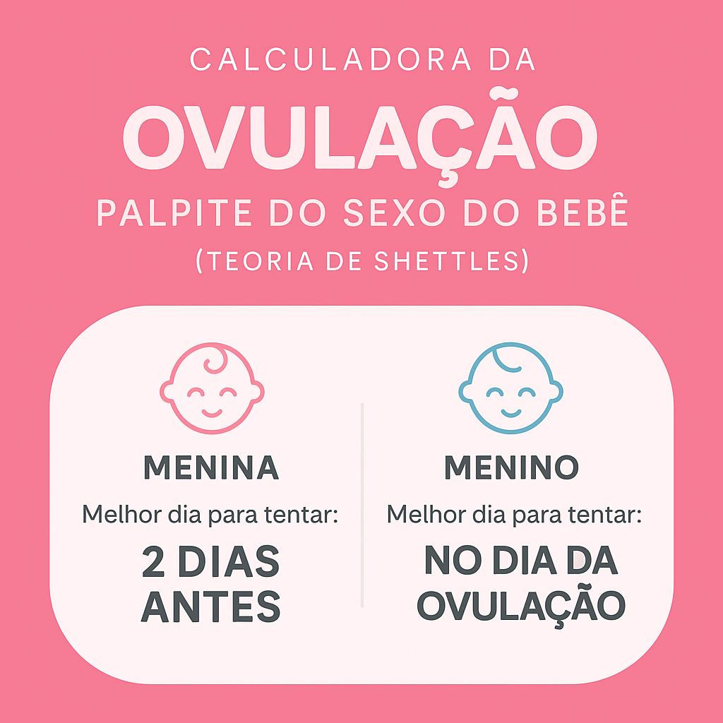 A ferramenta estima o período de ovulação com base na DUM e duração do ciclo, e traz um palpite do sexo do bebê segundo a Teoria de Shettles, que relaciona o momento da relação à chance de gerar menino ou menina.