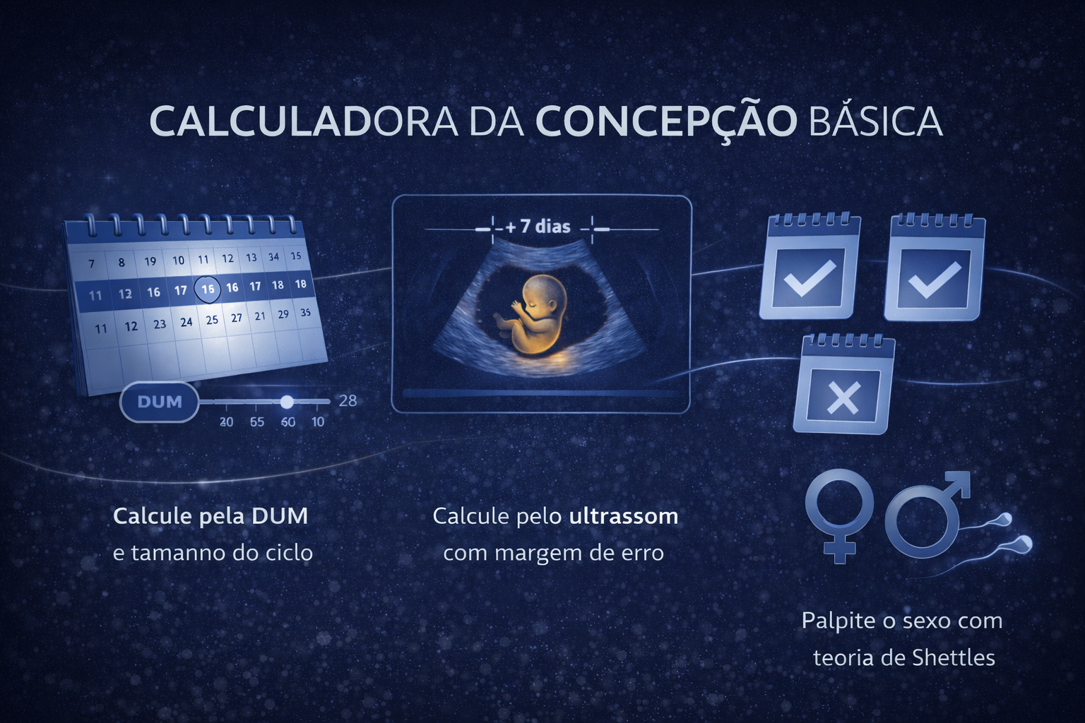 Com base na DUM ou no ultrassom, a ferramenta estima a data provável da fecundação e ainda oferece um palpite do sexo do bebê segundo a Teoria de Shettles.
